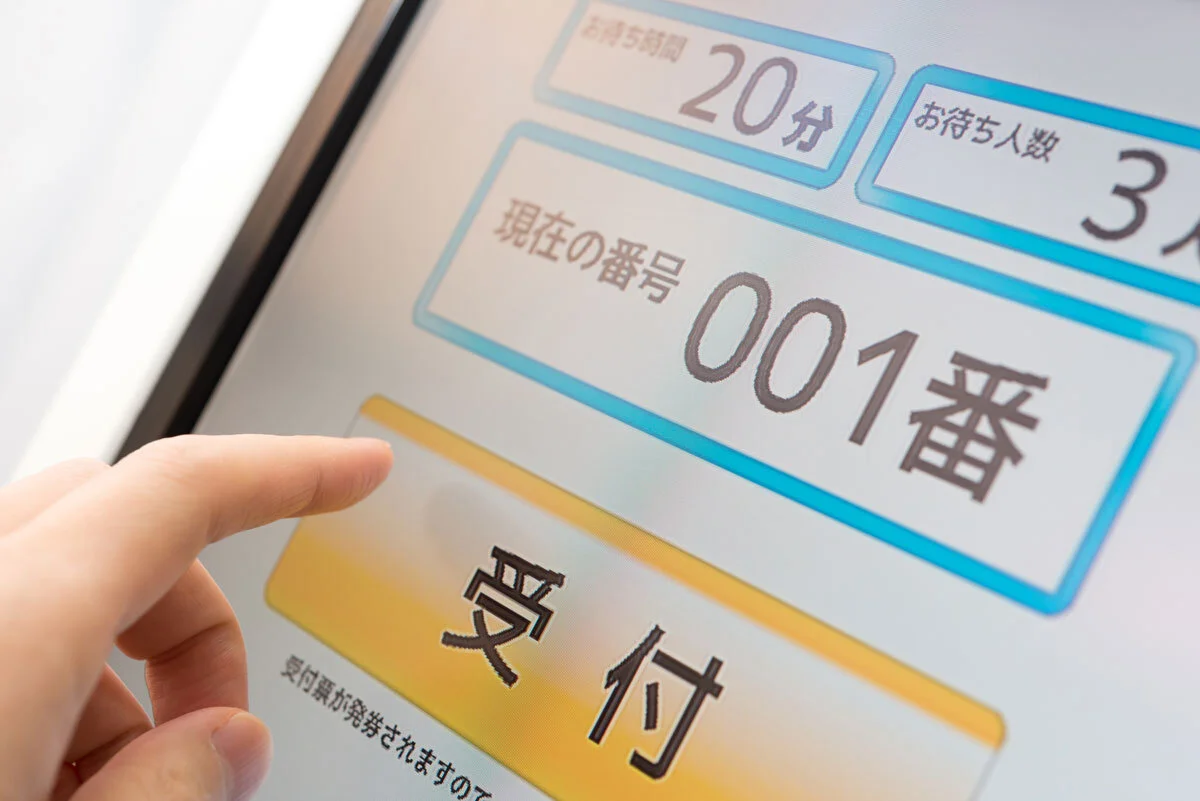 来店目的ごとに順番待ち整理が出来る発券機システム。通信機能搭載のため順番が近い来店者のスマホを呼び出したり、来店者自身が待ち状況をスマホから確認することも可能。発券された情報の統計や来店情報の日報アウトプットなども可能。